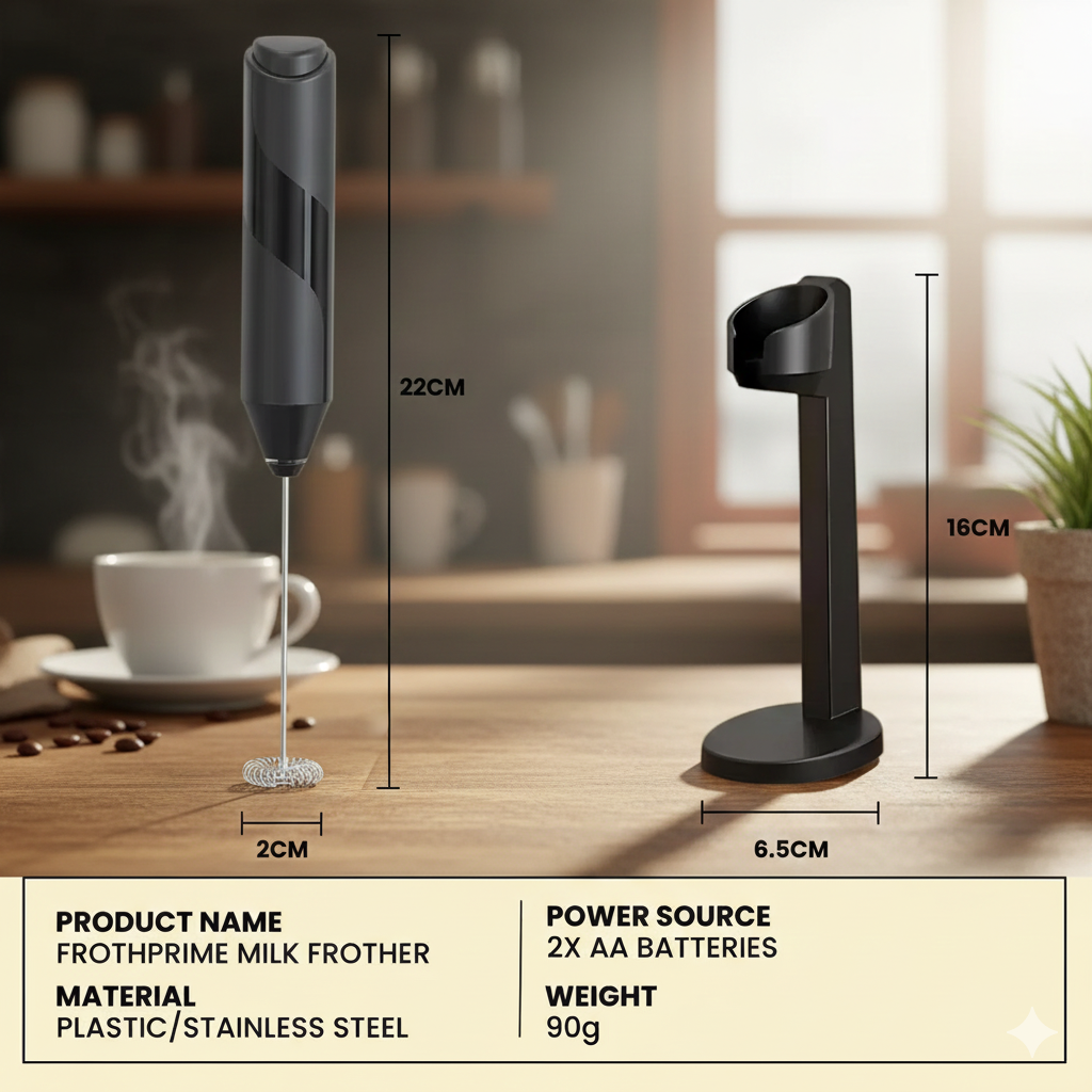 π Compact Build β Frother size: 22 Γ 2 cm (whisk diameter 2 cm).